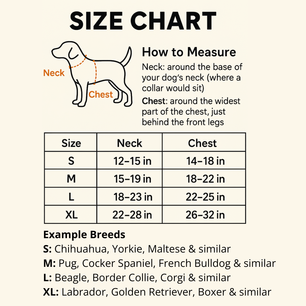 - XL: Neck 22–28 in | Chest 25–32 in | Labrador, Golden Retriever, or Boxer & similar